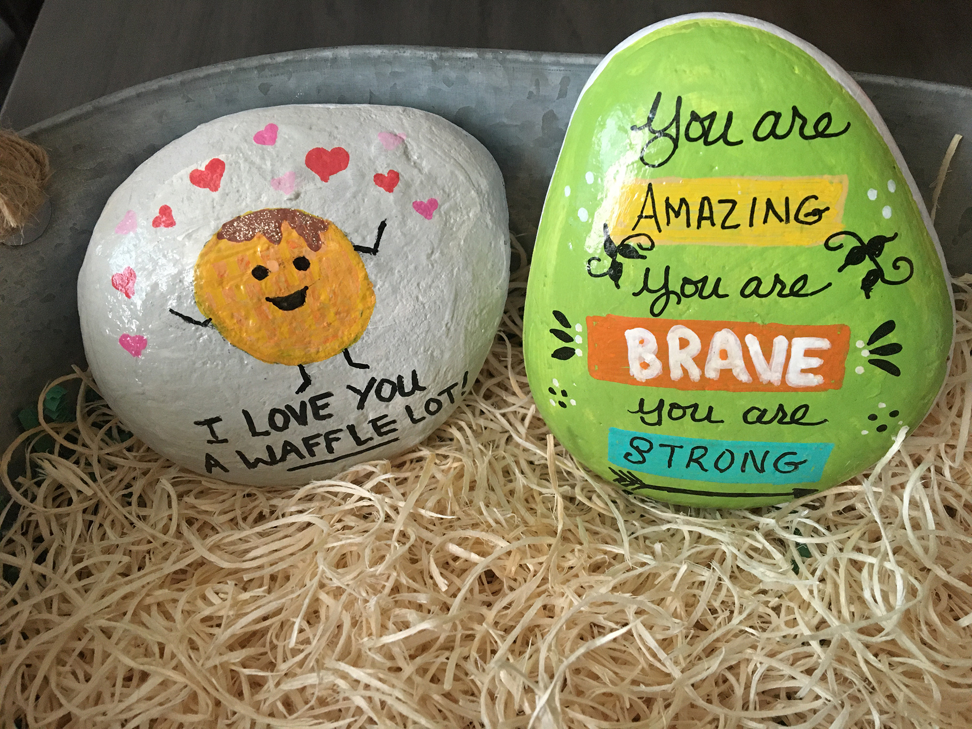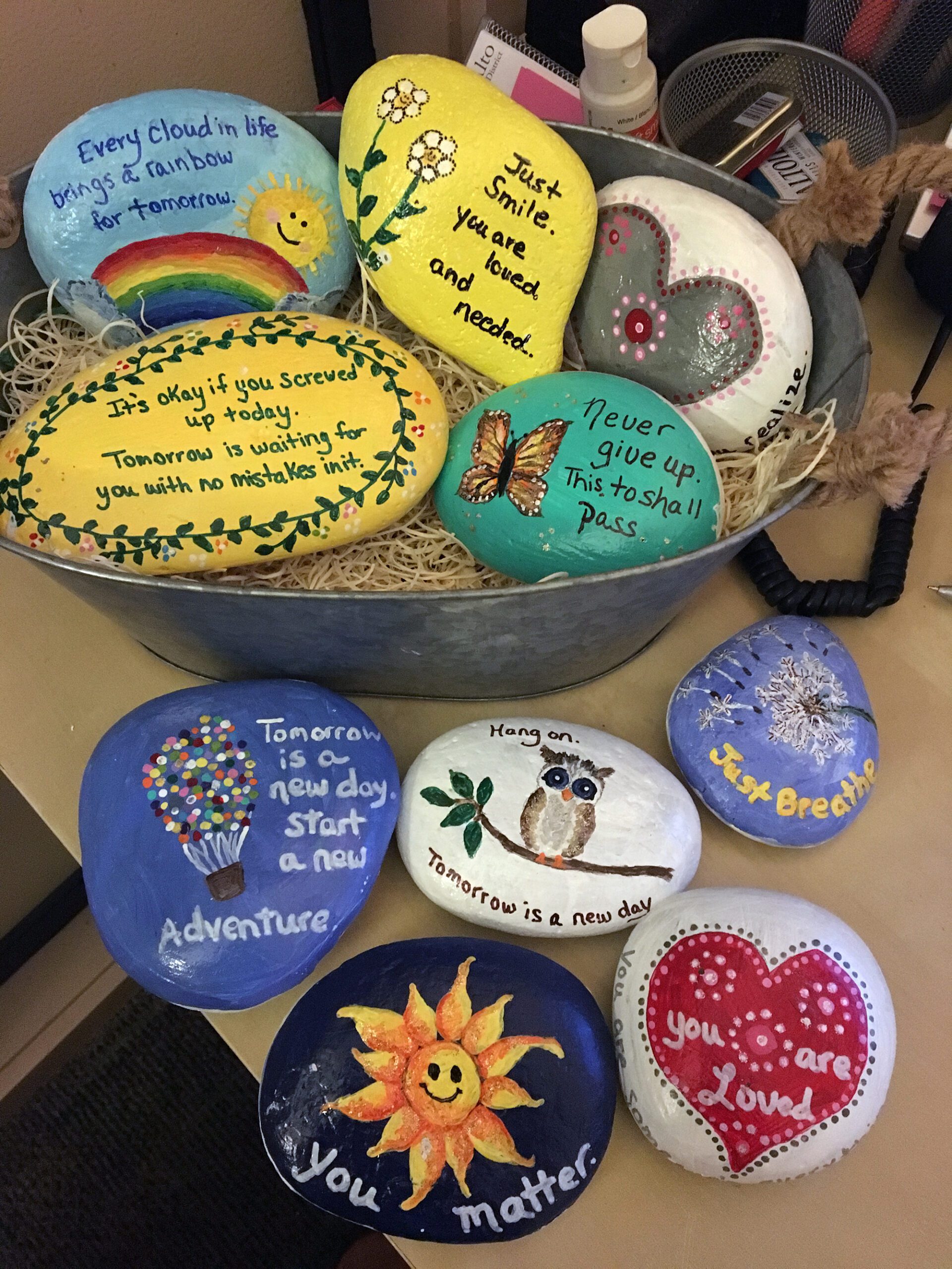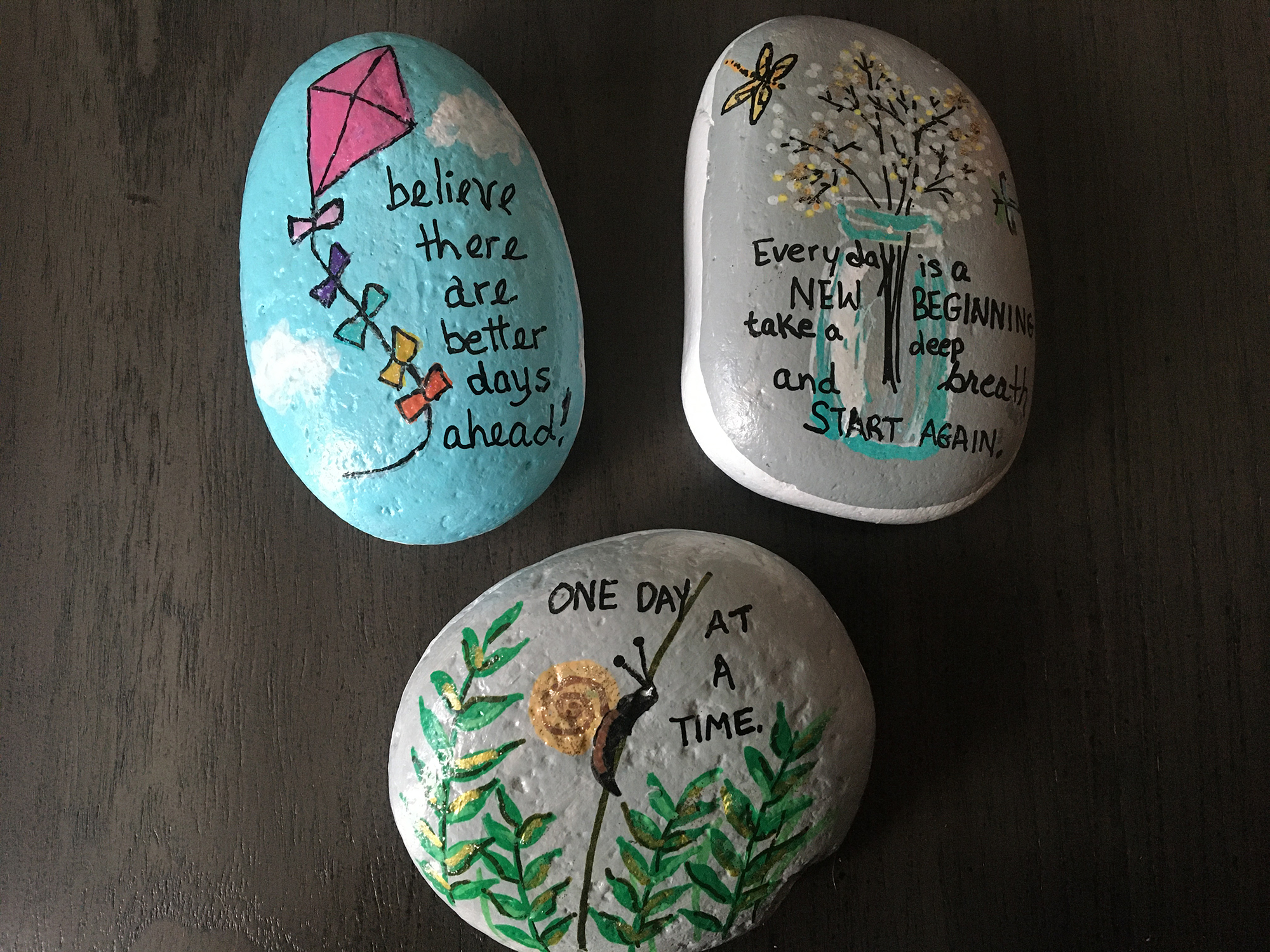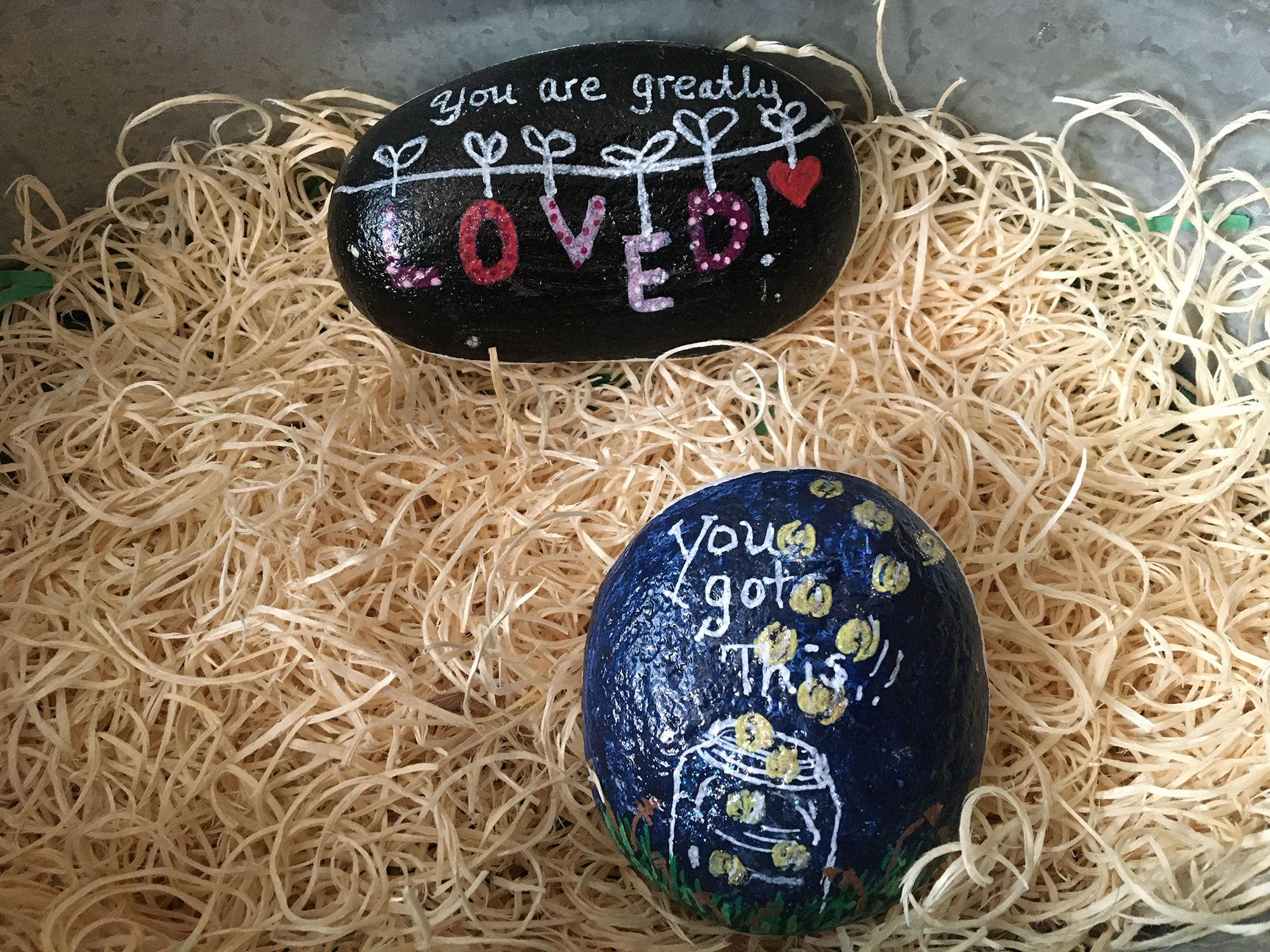Painted rocks with encouraging messages like "You got this!" and "Keep shining, beautiful one, the world needs your light"