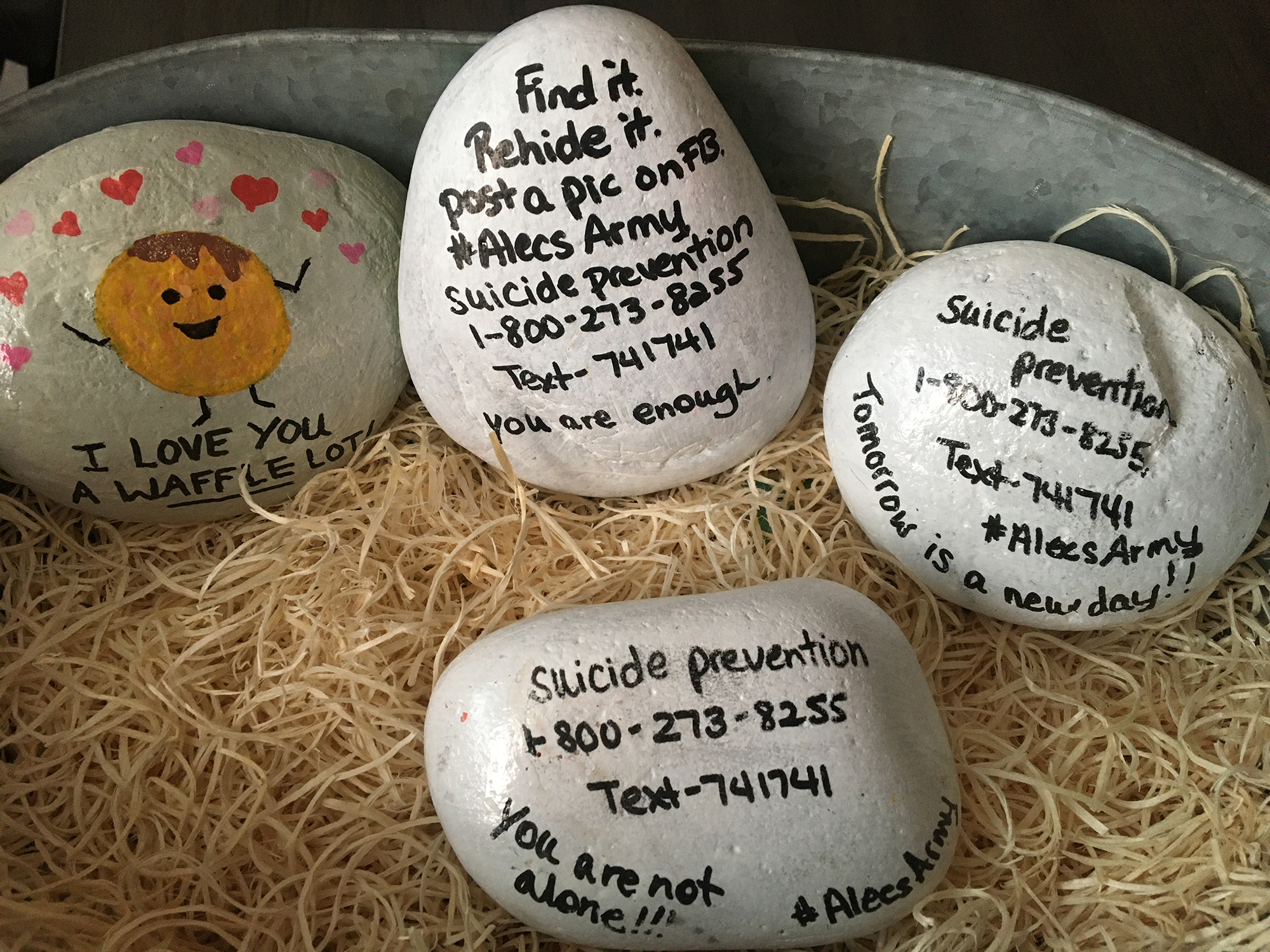 What began as a way to channel her grief, Jennifer Turner’s painted rock project turned into something extraordinary that has inspired and united people near and far. In loving memory of her son, Alexander (Alec) Turner, who died by suicide in August 2017, Jennifer began painting inspirational stones. On one side of the rocks are encouraging messages, and, on the other, suicide and crisis resource numbers. Jennifer creates many unique rocks, some with artwork that coincides with the changing seasons or holidays, others with special meaning related to her son’s favorite pastimes. Jennifer then leaves these beautifully decorated rocks in meaningful public places for others to find. Jennifer hopes that they will provide a sense of comfort and a symbol of hope while raising suicide awareness.
